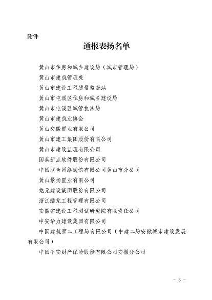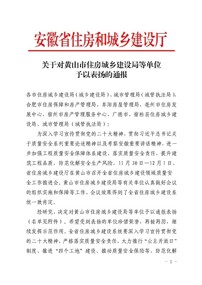 近日,安徽省住房和城鄉(xiāng)建設(shè)廳印發(fā)《關(guān)于對(duì)黃山市住房和城鄉(xiāng)建設(shè)局等單位予以表揚(yáng)的通報(bào)》,《通報(bào)》指出,11月30日-12月1日,省住房和城鄉(xiāng)建設(shè)廳在黃山市召開全省住房建設(shè)領(lǐng)域質(zhì)量安全工作推進(jìn)會(huì),會(huì)議效果得到全省住房城鄉(xiāng)建設(shè)系統(tǒng)一致肯定,并對(duì)在此次會(huì)議認(rèn)真做好組織實(shí)施和保障的單位予以通報(bào)表揚(yáng),黃山市建工集團(tuán)股份有限公司作為唯一一家本土建筑施工企業(yè)榮獲表揚(yáng)。