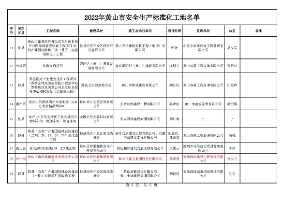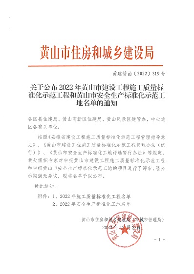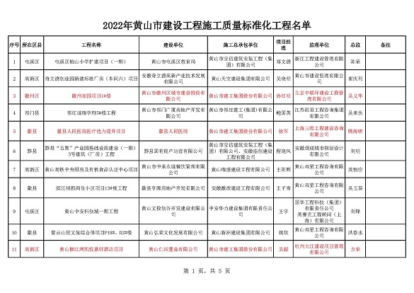黃山市建工集團(tuán)股份有限公司承建的徽州家園項(xiàng)目、歙縣人民醫(yī)院醫(yī)療能力提升項(xiàng)目、黃山橫江灣凱悅酒店項(xiàng)目、高鐵黟縣東站站前廣場及附屬配套工程、黃山市南部城鎮(zhèn)群水務(wù)調(diào)度中心項(xiàng)目、黃山北海路公交綜合大樓工程榮獲2022年施工質(zhì)量標(biāo)準(zhǔn)化工程和安全生產(chǎn)標(biāo)準(zhǔn)化工地的殊榮。