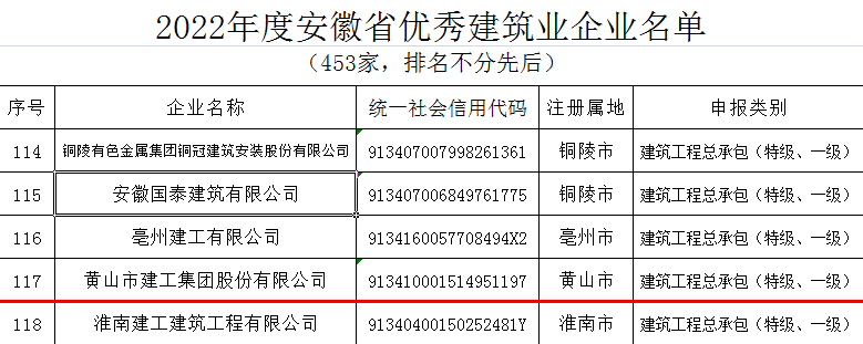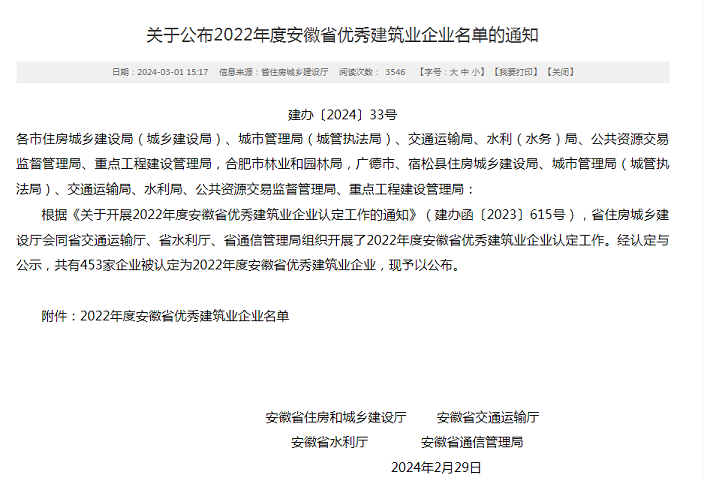 近日,安徽省住房和城鄉(xiāng)建設廳發(fā)布了“2022年度安徽省優(yōu)秀建筑業(yè)企業(yè)”名單,黃山建工集團憑借企業(yè)經營發(fā)展、管理創(chuàng)新能力、企業(yè)建造能力、企業(yè)文化建設、社會責任履行等方面的卓越表現再次名列榜單――建筑工程總承包類(特級、一級類別)省優(yōu)秀建筑業(yè)企業(yè),連續(xù)多年斬獲該項殊榮。