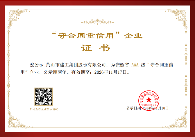 近日,黃山建工集團(tuán)憑借健全的信用管理體系、優(yōu)良的合同履約信用狀況和良好的市場(chǎng)信譽(yù)榮獲安徽省AAA級(jí)“守合同重信用”企業(yè)稱號(hào)。這一榮譽(yù)的獲得,不僅是對(duì)黃山建工集團(tuán)在企業(yè)經(jīng)營(yíng)過(guò)程中始終堅(jiān)持誠(chéng)信經(jīng)營(yíng)的肯定,也是對(duì)黃山建工集團(tuán)在合同履行和信用管理方面所取得的顯著成績(jī)的認(rèn)可。