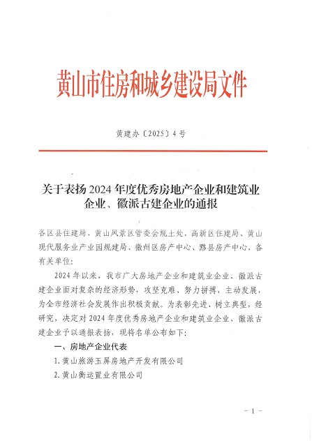 近日,黃山市住房和城鄉(xiāng)建設(shè)局發(fā)布了《關(guān)于表揚2024年度優(yōu)秀房地產(chǎn)企業(yè)和建筑業(yè)企業(yè)、徽派古建企業(yè)的通報》,黃山建工集團(tuán)榮獲2024年度優(yōu)秀建筑業(yè)企業(yè)稱號。