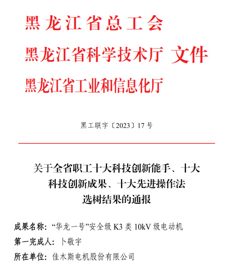 近日,黑龍江省總工會、省科學(xué)技術(shù)廳、省工業(yè)和信息化廳發(fā)布了全省職工“十大科技創(chuàng)新能手、十大科技創(chuàng)新成果、十大先進(jìn)操作法”選樹名單,哈爾濱電氣集團(tuán)佳木斯電機(jī)股份有限公司(以下簡稱“佳電股份”)《“華龍一號”安全級K3類10kV級電動機(jī)》成果喜獲“十大科技創(chuàng)新成果”殊榮。