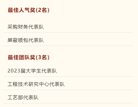 經(jīng)過激烈角逐,現(xiàn)場評委通過藝術表現(xiàn)力、動作設計、服裝儀表等五個方面對參賽隊伍認真考評,最終產品制造部代表隊以最高分獲得一等獎,大型車間代表隊、人力經(jīng)濟辦公室設備與信息化部代表隊獲得二等獎,沖剪車間代表隊、電工車間代表隊、內貿外貿運維科技代表隊獲得三等獎,小型車間代表隊、質量保障部代表隊獲得最佳組織獎,采購財務代表隊、屏蔽噴包代表隊獲得最佳人氣獎,2023屆大學生代表隊、工程技術研究中心代表隊、工藝部代表隊獲得最佳團隊獎。