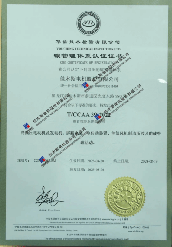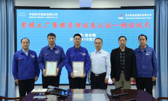 10月27日,華信技術(shù)檢驗(yàn)有限公司在哈電集團(tuán)佳木斯電機(jī)股份有限公司(以下簡(jiǎn)稱(chēng)“佳電股份”)舉行零碳工廠暨碳管理體系認(rèn)證頒證儀式,佳電股份獲評(píng)《碳管理體系認(rèn)證證書(shū)》與《零碳工廠評(píng)價(jià)證書(shū)》,成為國(guó)內(nèi)電機(jī)行業(yè)首家通過(guò)《零碳工廠評(píng)價(jià)規(guī)范》新標(biāo)準(zhǔn)認(rèn)證的企業(yè),標(biāo)志著佳電股份在高端化、智能化、綠色化發(fā)展道路上邁出的關(guān)鍵一步。
